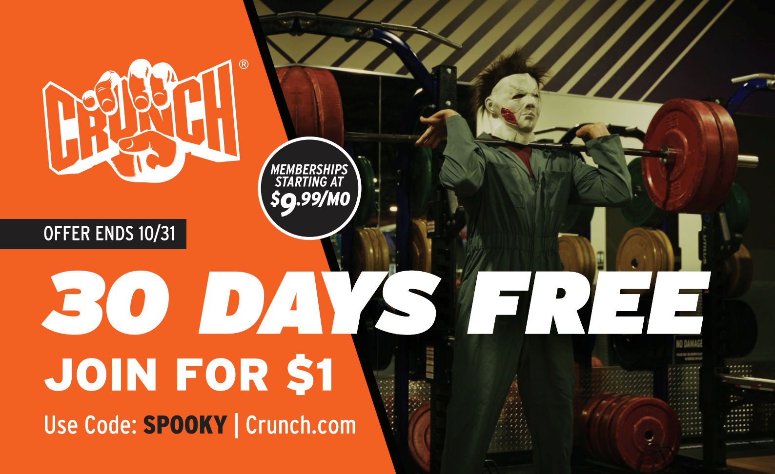 October 24–31: Join Crunch for just $1 and get 30 days free! Memberships start at only $9.99/month — sign up now at Crunch.com.